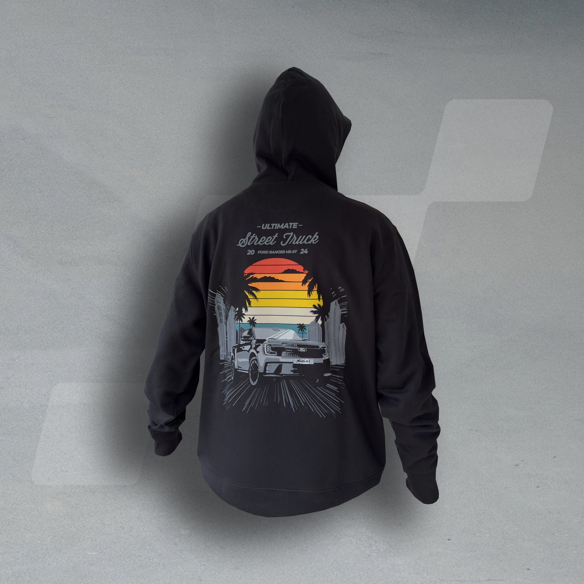 This sleek black hoodie showcases a retro sunset graphic with the powerful Ranger MS-RT street truck at its heart, perfect for the MS-RT enthusiasts who live for the road. Featuring a soft, comfortable fit and durable construction, it's designed to keep you cozy and stylish wherever your journey takes you.